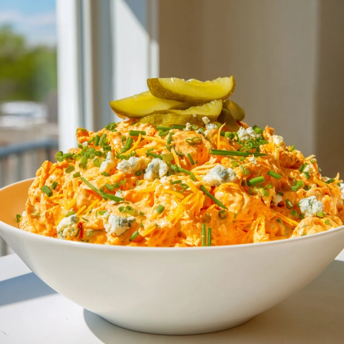 This zesty dip blends smooth cream cheese, sour cream, and mayonnaise with tangy buffalo wing sauce and chopped dill pickles. The sharp cheddar adds richness while fresh chives bring brightness. Ready in just 10 minutes, it's an effortless crowd-pleaser that works equally well for casual snacking or game day spreads. Serve it cold alongside your favorite dippers, or gently warm it for extra comfort.