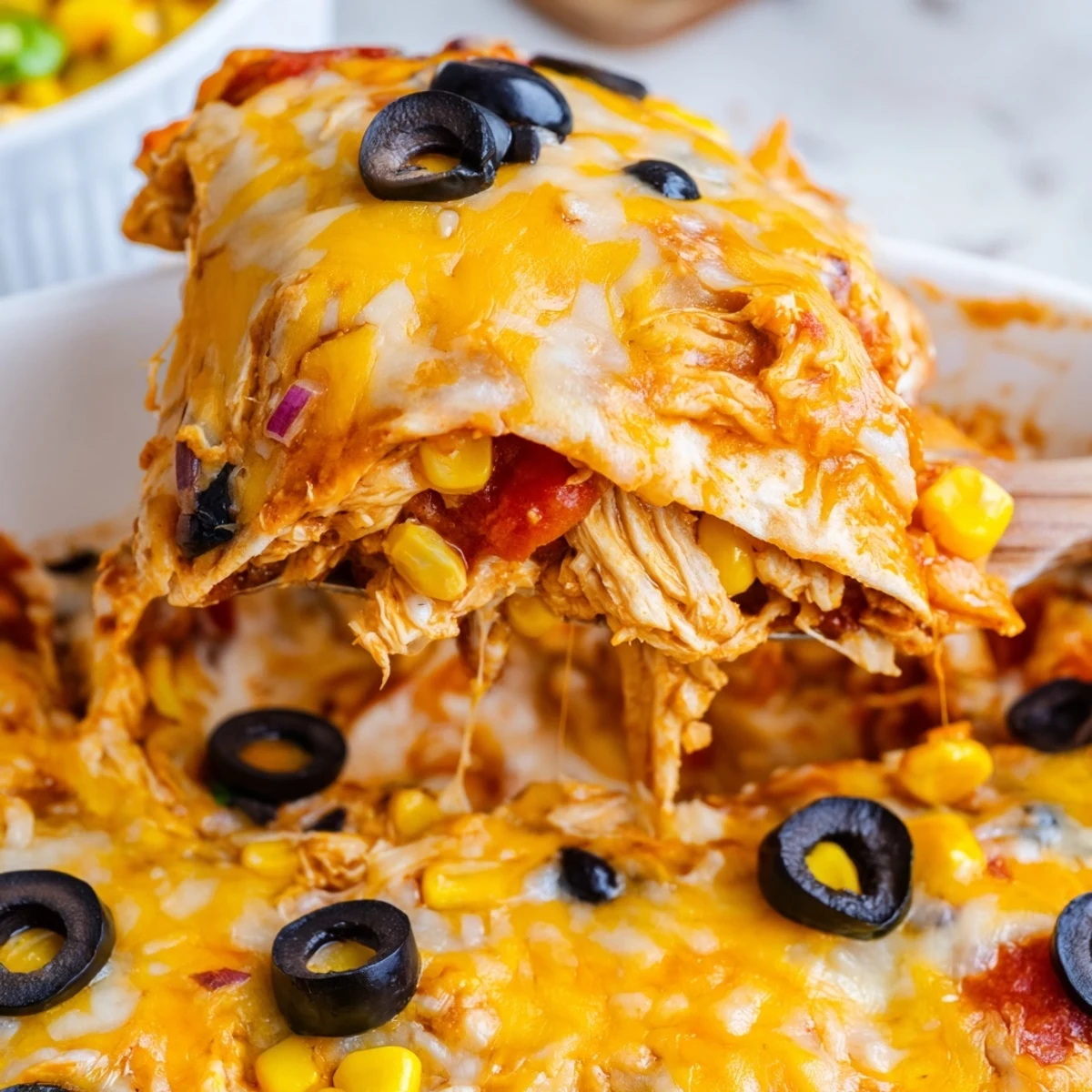 - Top with the last tortillas, pour remaining sauce over everything so no dry spots peek through, then cover with remaining cheese and olives if you're using them