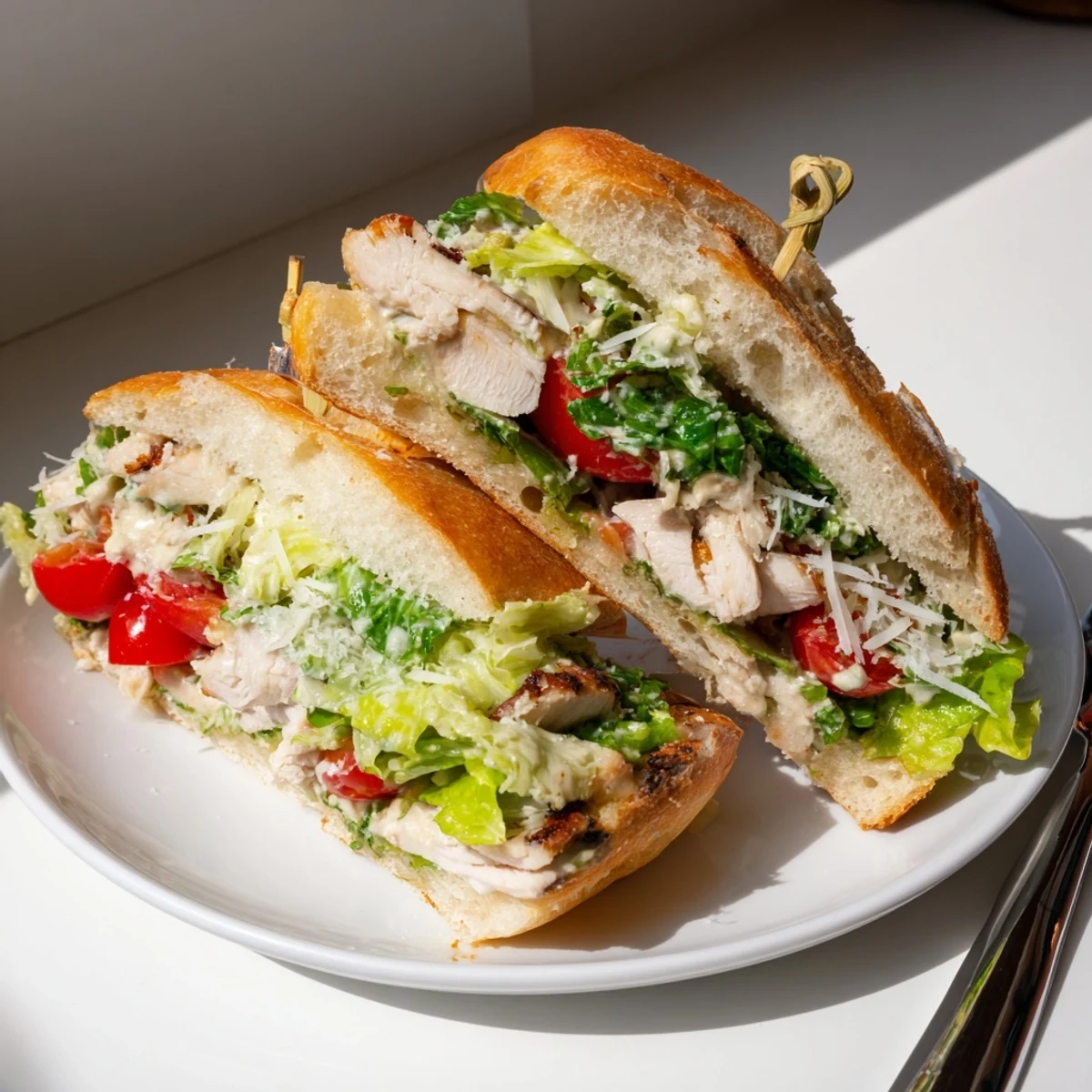 Buttered ciabatta rolls toast until golden and crisp, providing the perfect foundation for shredded romaine, thinly sliced chicken, additional shaved Parmesan, and optional cherry tomatoes. The entire assembly comes together in just 30 minutes, making it ideal for weeknight dinners or meal prep lunches.