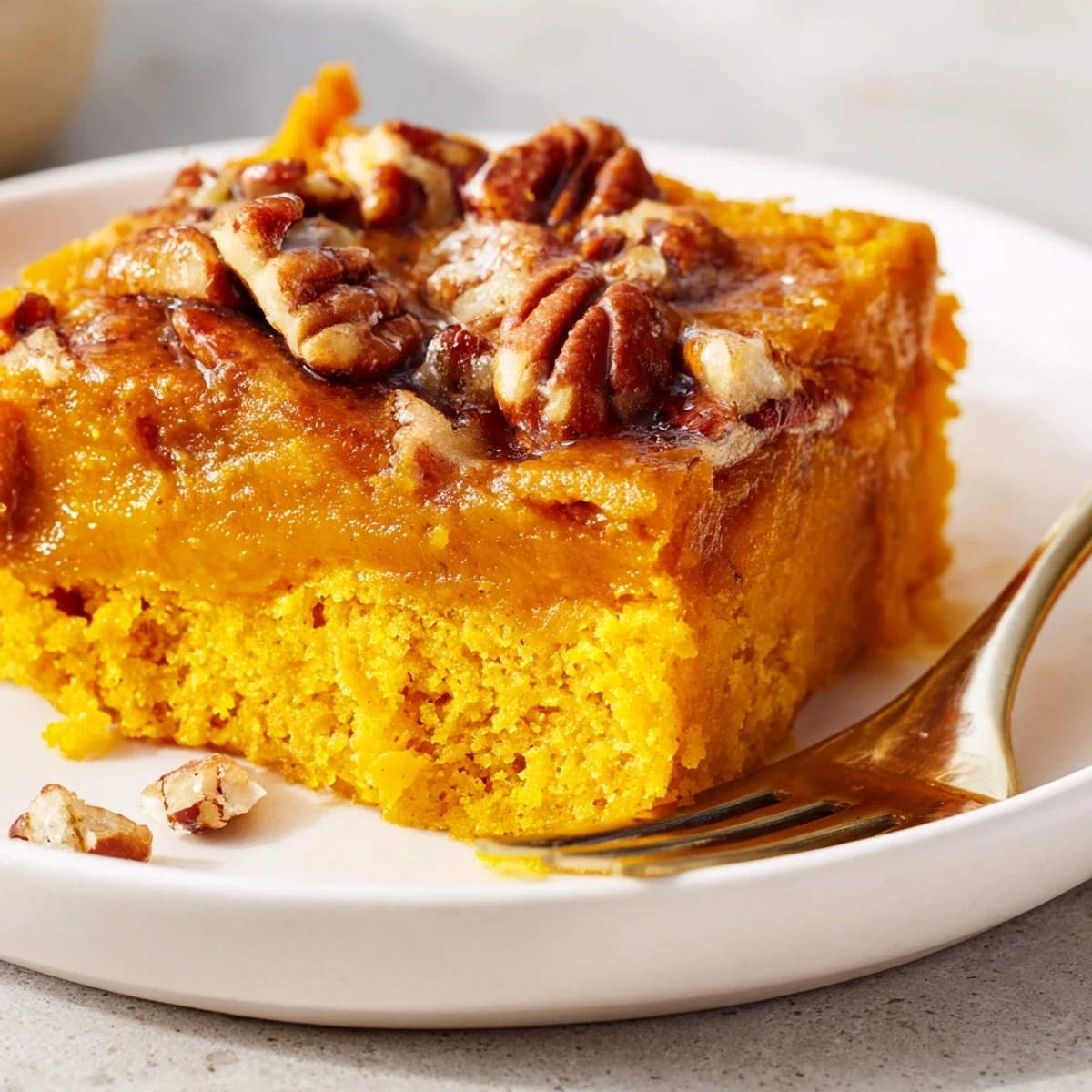The pumpkin custard and melted butter create a moist, custardy interior that firms on cooling. A slightly gooey center is normal and desirable; extended baking will dry it out, so follow the 45–55 minute guideline and cool properly.