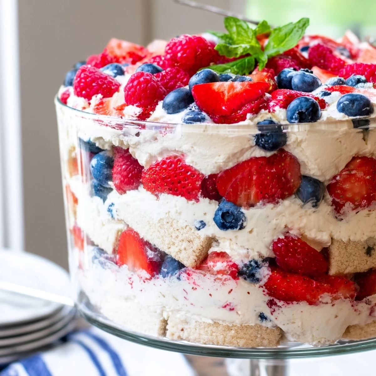 A glass trifle bowl showcases the beautiful layers perfectly. Individual clear serving glasses or mason jars also work wonderfully for single portions. Any clear vessel will display the patriotic colors.